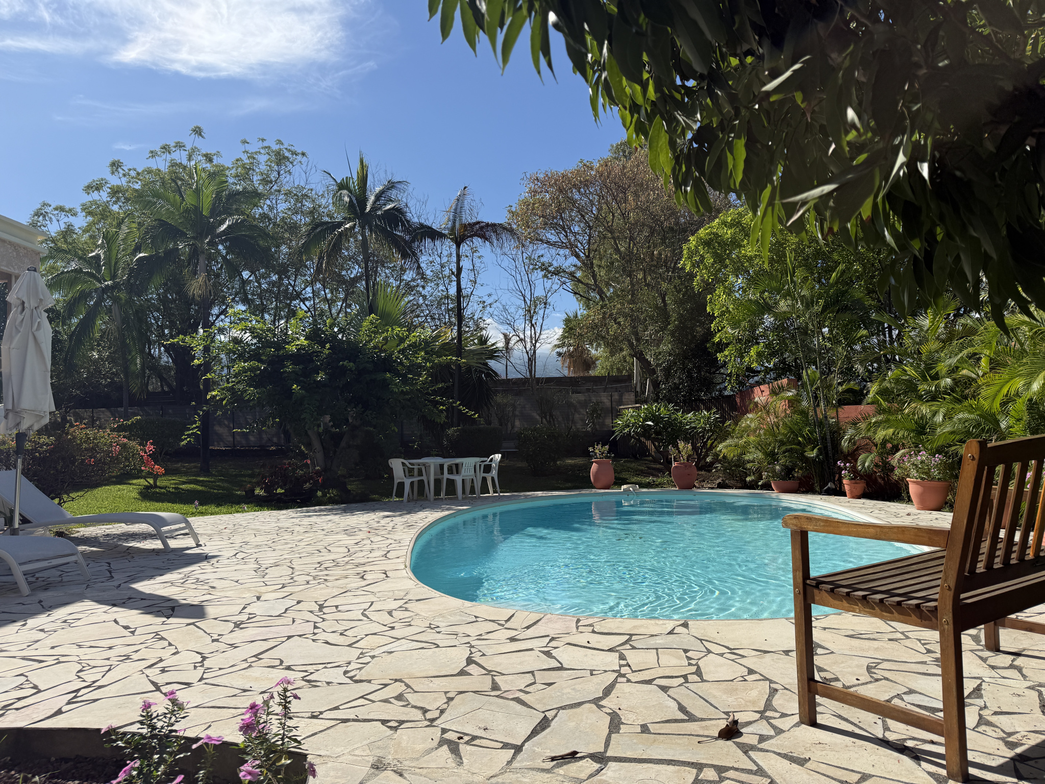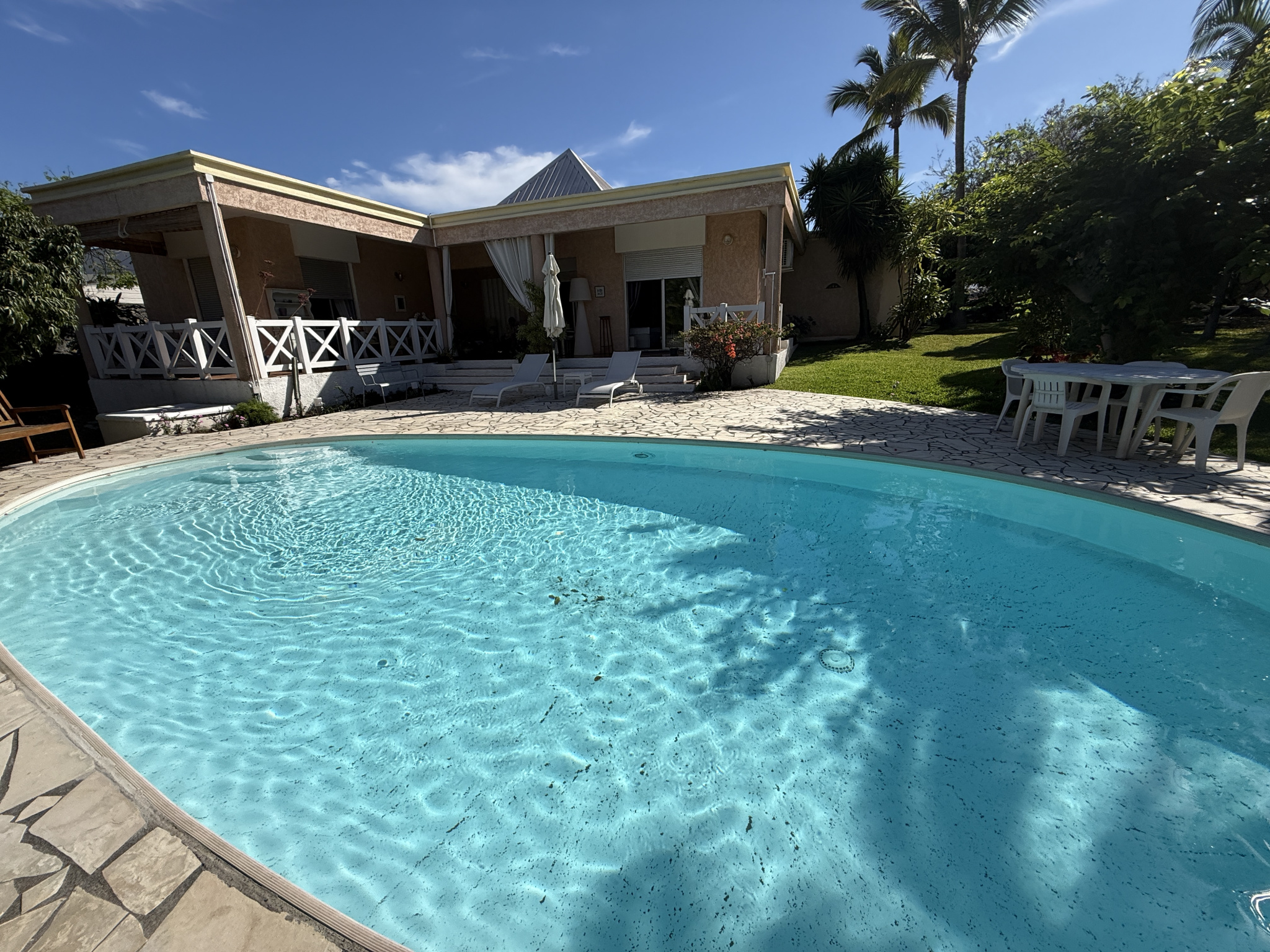 Dès l'entrée, vous serez immédiatement captivé par le vaste jardin verdoyant, véritable écrin de nature, méticuleusement entretenu par les propriétaires. Le terrain se compose d'arbres emblématiques de La Réunion : Palmiers majestueux qui bordent élégamment la propriété, Manguier, Litchi offrant un charme tropical unique. Cet espace extérieur procure une sensation de bien-être, d'intimité et de liberté. Il représente un véritable atout, tant pour les amoureux de la nature que pour les familles souhaitant disposer d'un grand espace sécurisé. La maison dispose d'une piscine, entourée de plages aménagées, permettant de profiter de moments de détente en famille ou entre amis. Les varangues, d'une superficie de 45 m2, prolongent harmonieusement l'espace intérieur vers le jardin, créant un lieu convivial idéal pour les repas, les soirées d'été ou tout simplement.